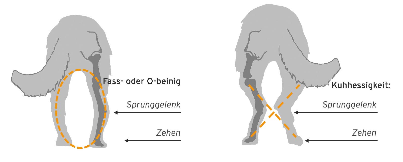 | Name der Erkrankung | Fassbeinigkeit (Bow-leggedness) | Kuhhessigkeit (Cow-hocked) |