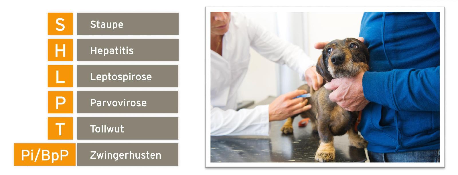 Vor dem Absetzen der Welpen sollten diese gegen SHLPT geimpft sein; manche Tierärzte impfen gegen Tollwut erst später. Mit etwa 12 bis 14 Wochen sollten die ersten Nachimpfungen erfolgen und dann nach einem Plan des Tierarztes in bestimmten Abständen wiederholt werden. Die Pharmaindustrie bietet verschiedene Kombinationsmöglichkeiten der Impfstoffe an, bis hin zu einer Einmalimpfung gegen mehrere Krankheiten wie Staupe, Hepatitis, Tollwut, Parvovirose und Zwingerhusten.
