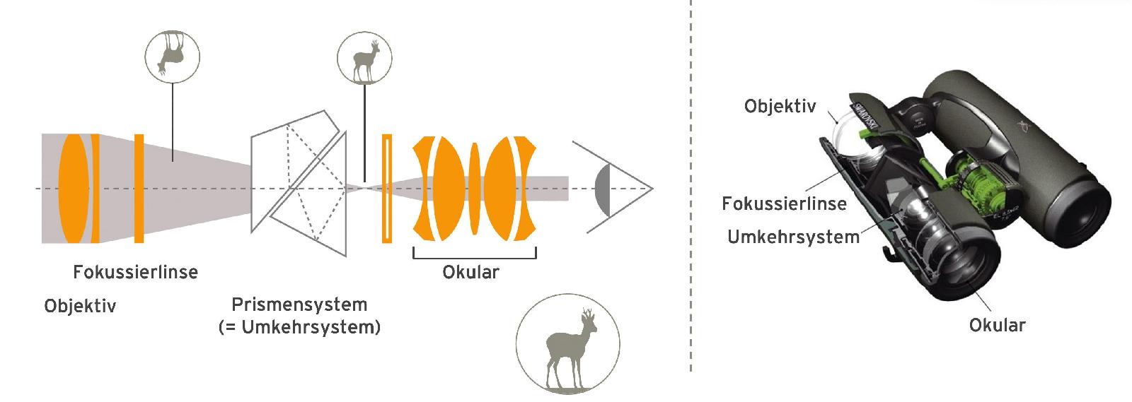 Ferngläser und Zielfernrohre haben die Aufgabe, entfernte Objekte durch Vergrößerung näher zu bringen, um Details besser erkennen zu können. Dies geschieht durch die lichtbrechenden Eigenschaften von Linsen und Prismen. Ein Fernglas besteht aus dem Objektiv, dem Umkehrsystem und dem Okular. Das Objektiv liefert ein seitenverkehrtes Bild, das durch das Umkehrsystem wieder richtiggestellt und im Okular betrachtet wird. Optische Geräte werden in der Regel durch zwei Zahlen gekennzeichnet: die erste steht für die Vergrößerung, die zweite für den Objektivdurchmesser.