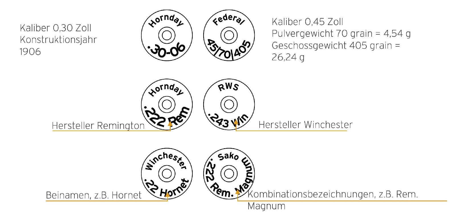 Auf dem Boden der Patronenhülsen sind um das Zündhütchen herum das Herstellerzeichen und die genaue Kaliberbezeichnung eingeprägt. Deutsche Kaliberbezeichnungen wie 5,6x50R Mag. geben das Kaliber, die Hülsenlänge und zusätzliche Informationen wie "Magnum" an. Amerikanische und englische Kaliberbezeichnungen werden in Zoll angegeben und enthalten oft Zusätze, die auf den Hersteller oder besondere Eigenschaften der Patrone hinweisen.