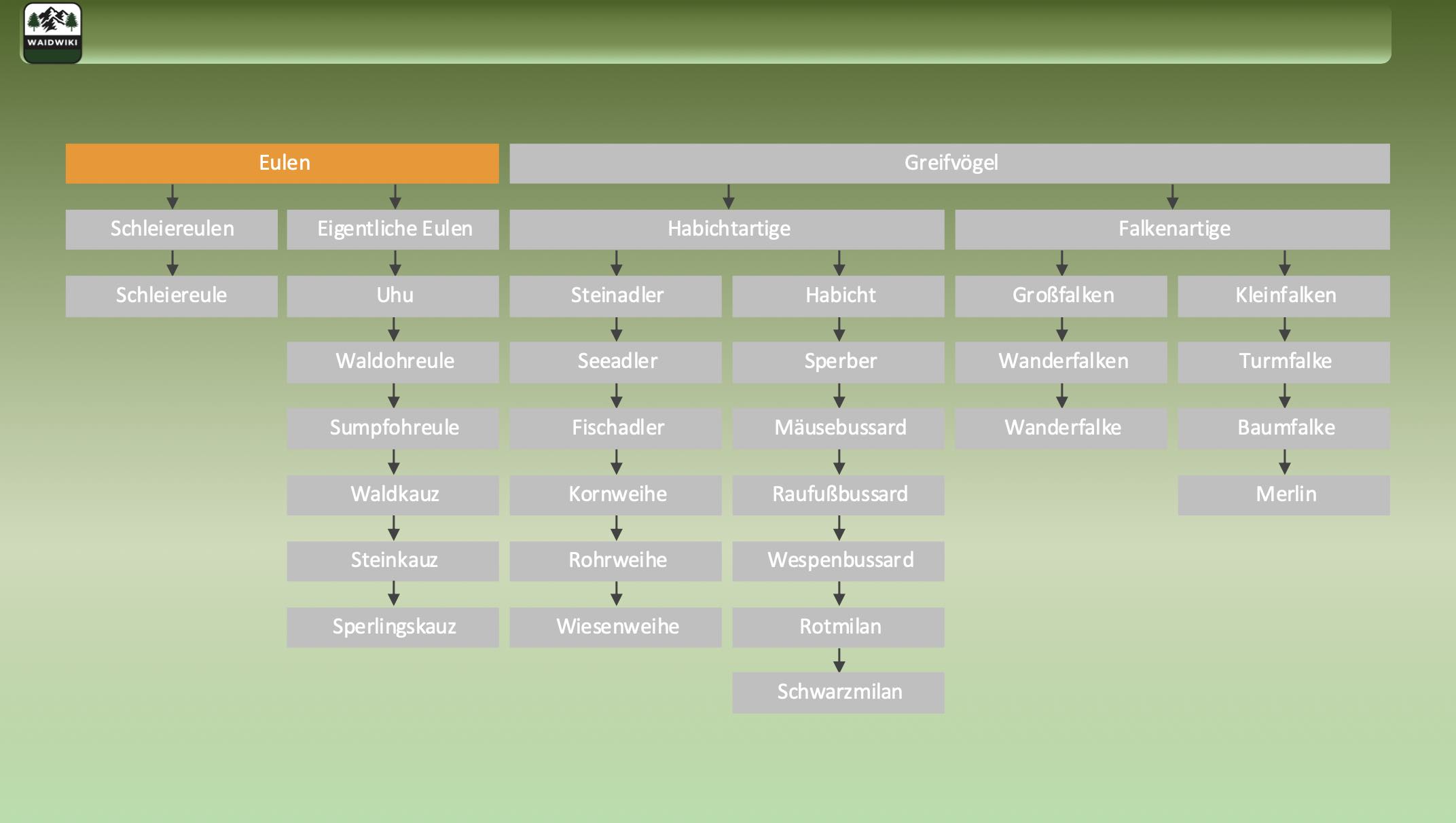 Eulen gehören nicht zu den jagdbaren Tieren. Obwohl sie einige äußerliche Ähnlichkeiten mit Greifvögeln haben, wie den Schnabel und die mit Klauen versehenen Fänge, gibt es keine verwandtschaftlichen Beziehungen zwischen ihnen. Die Bezeichnung "Nachtgreifvögel" ist daher irreführend.