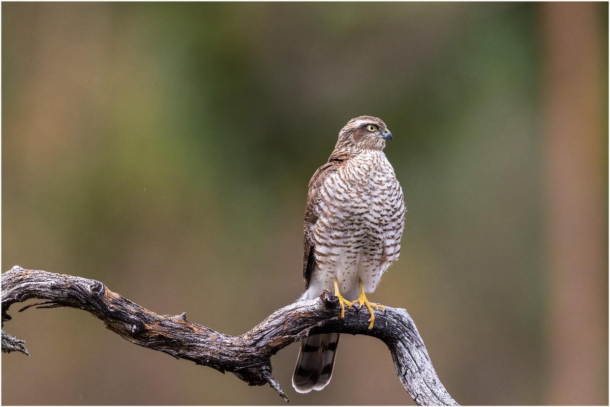 - Orange oder gelbes Auge, langer Schwanz mit 4-5 Querbändern, kurze runde Schwingen.