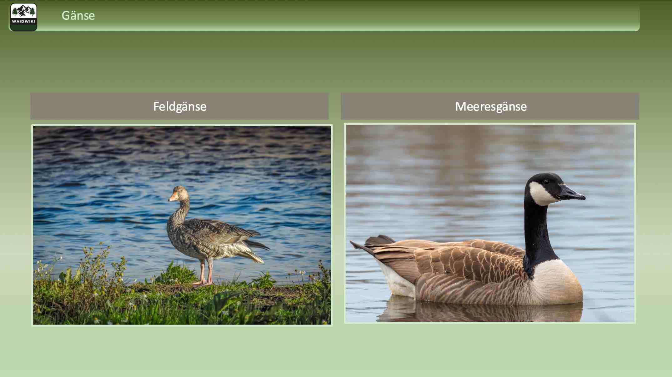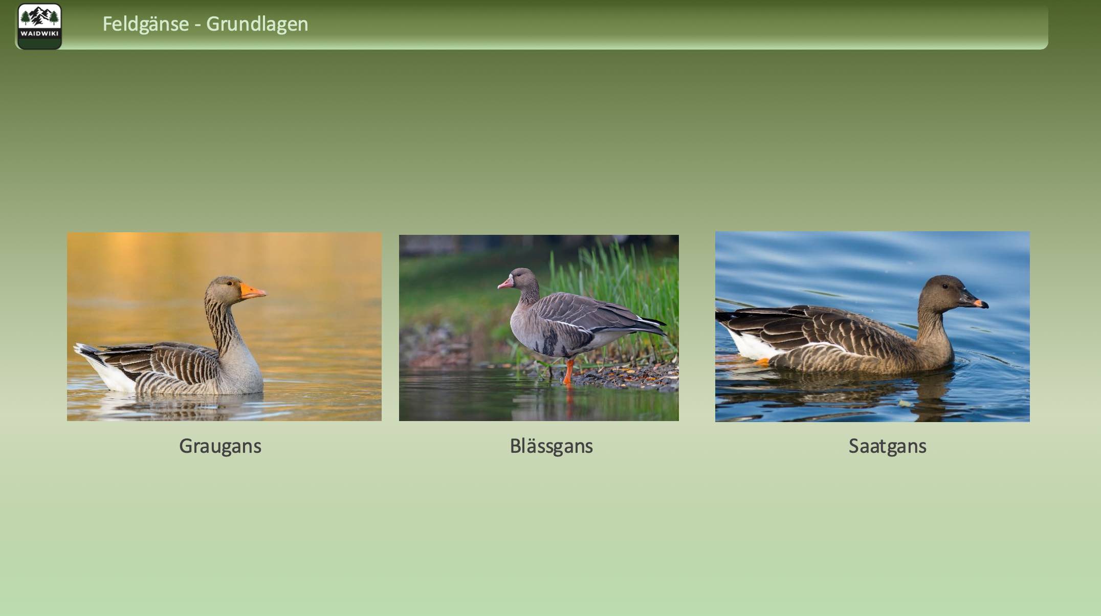 Wildgänse: Graugans, Saatgans, Bläßgans, Kanadagans, Ringelgans, Weißwangengans