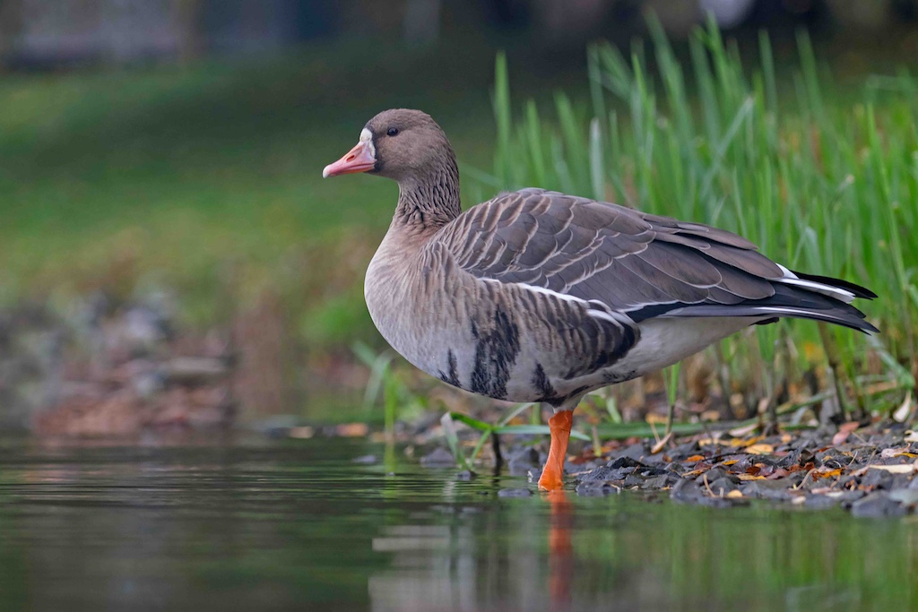 - Aussehen: Dunkler und kleiner als die Graugans, mit schwarzen Querbändern auf der Brust. Weiße Stirn und fleischfarbener Schnabel mit hellem Nagel.