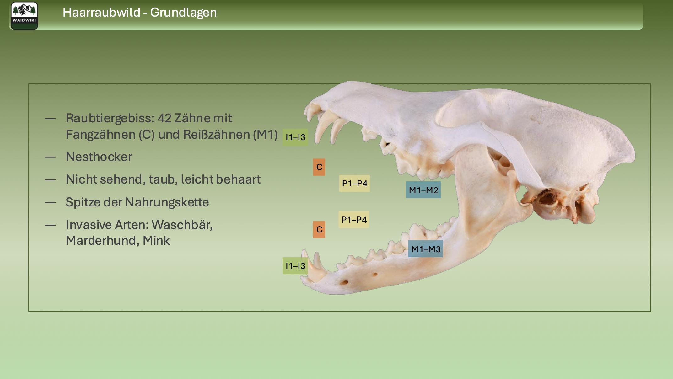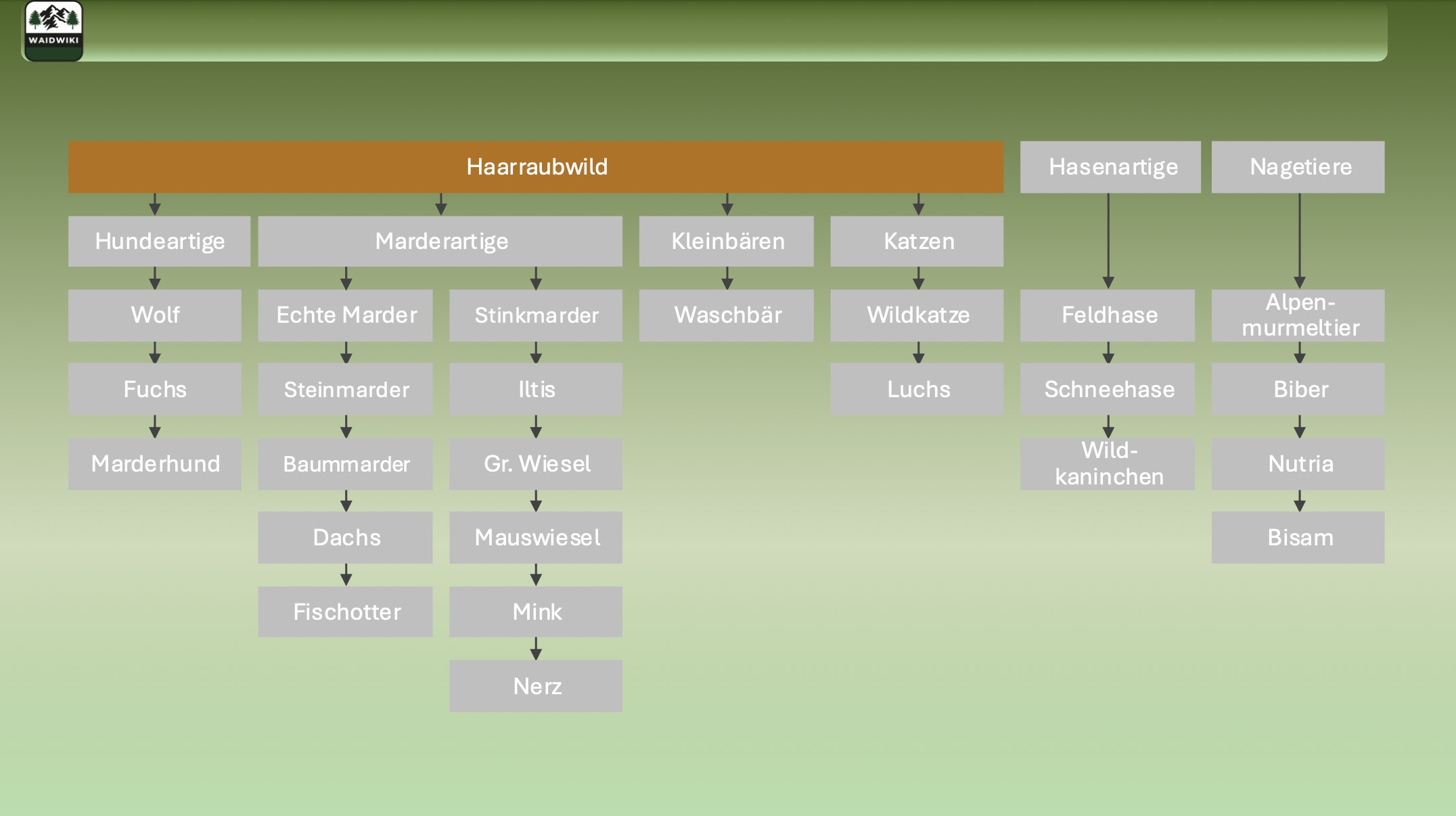 - Haarraubwild: Hierzu gehören Raubsäuger wie Fuchs (Vulpes vulpes), Marder (Martes martes), Dachs (Meles meles) und Wildkatze (Felis silvestris).