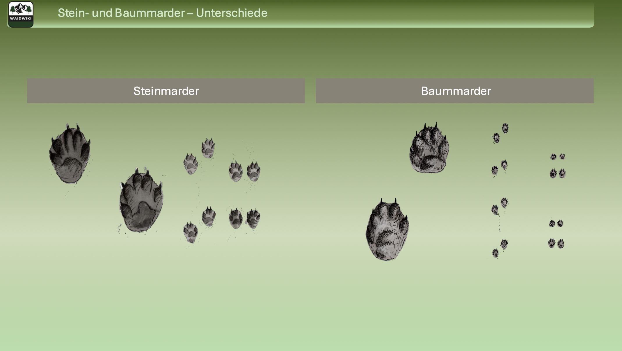 Im äußeren Erscheinungsbild ähneln sich Stein- und Baummarder sehr. Sie unterscheiden sich jedoch durch ihre Lebensweise, Färbung und das Gebiss. Beim Steinmarder sind die Zehen- und Sohlenballen nackt, während sie beim Baummarder behaart sind.