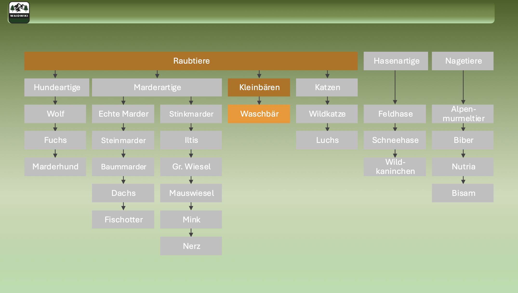 Der Waschbär, ursprünglich in Nordamerika beheimatet, wurde zwischen 1927 und 1934 gezielt in Mitteleuropa ausgesetzt und entkam aus Pelztierfarmen in die freie Wildbahn. Heute ist er in allen Bundesländern Deutschlands nachgewiesen und besiedelt weite Teile Mitteleuropas. Aufgrund seiner heimlichen und nächtlichen Lebensweise wird der Waschbär selten beobachtet, weshalb die tatsächliche Population wahrscheinlich höher ist als vermutet. Seine ökologische Rolle in Mitteleuropa ist unklar, daher sollte die Jägerschaft darauf achten, die Waschbärenpopulation nicht weiter anwachsen zu lassen.