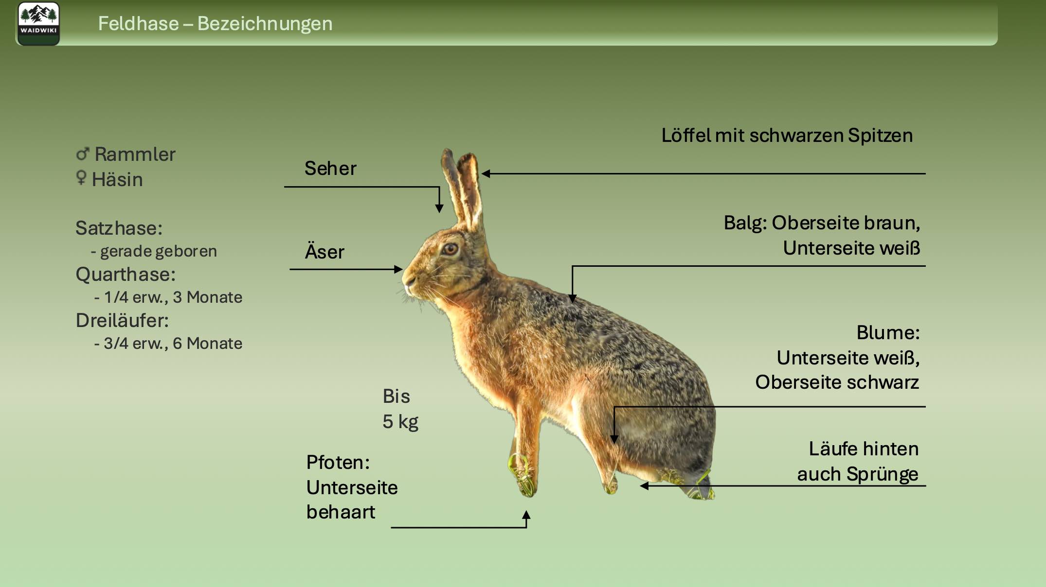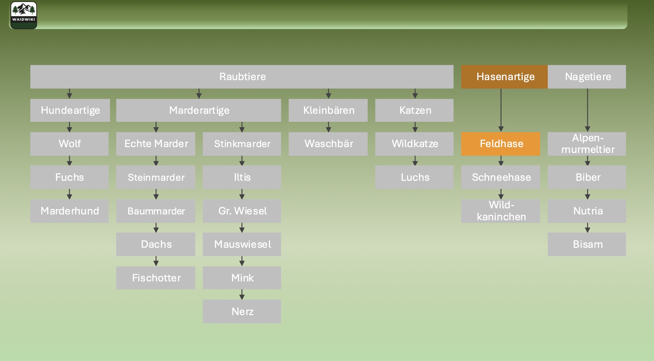 Der Feldhase gehört neben dem Schneehasen und dem Wildkaninchen als echter Hase zur Ordnung der Hasenartigen. Er kommt fast in ganz Europa vor. Ehemals eine der häufigsten Arten unserer Wildbahn, ist der Hasenbesatz durch die veränderte ökologische Situation (Landwirtschaft, Beutegreifer) stark zurückgegangen. Die Hasenstrecke erreicht in Deutschland zahlenmäßig nurmehr die des Fuchses und bleibt vielerorts beispielsweise hinter der Reh- und Schwarzwildstrecke deutlich zurück. Kennzeichen. Auffallend an dem Fluchttier sind der gestreckte, durch die langen Hinterläufe stark überbaute Körper, lange Löffel, kurze Blume, große, seitwärts gerichtete gelbliche Seher mit schwarzer Pupille.