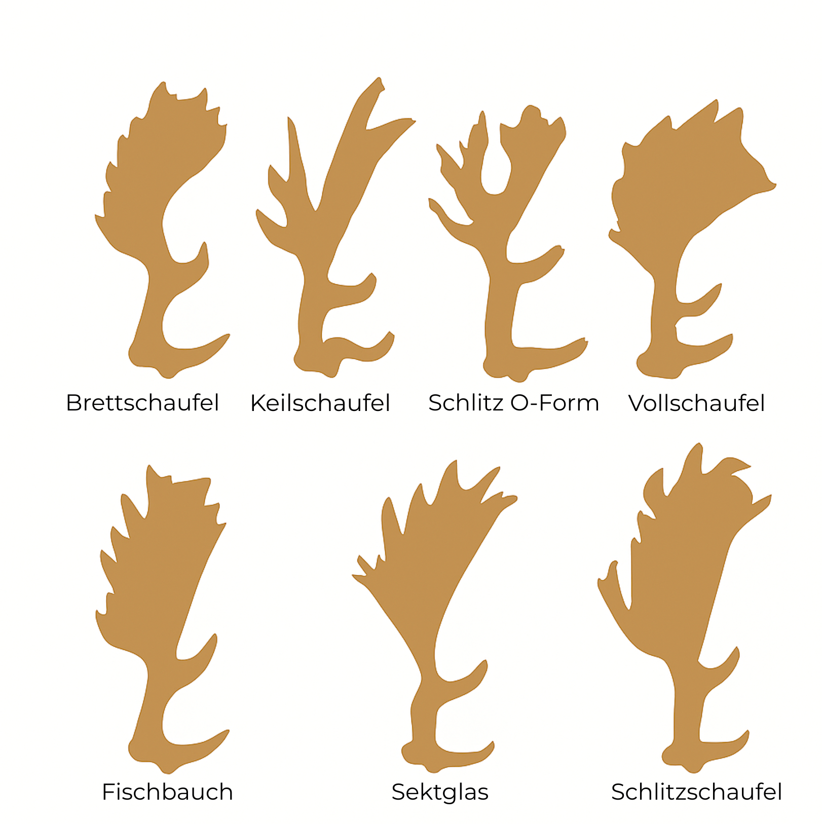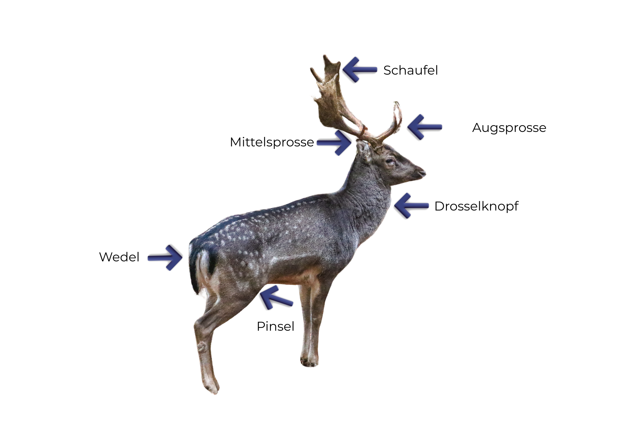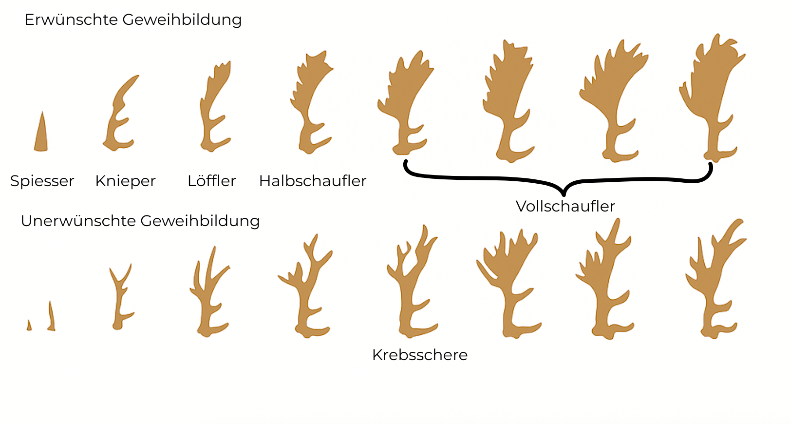 - Entwicklung: Das erste Geweih schiebt der Damhirsch im Mai/Juni des zweiten Lebensjahres. Mit dem zweiten Geweih bilden sich Aug- und Mittelsprossen sowie schwache Schaufeln. Weitere Entwicklungsstufen sind Löffler, Halbschaufler und Vollschaufler. Die Schaufeln können viele Enden aufweisen, das unterste Ende heißt Schaufelhaken. Geweihe werden im August/September gefegt und im April abgeworfen.