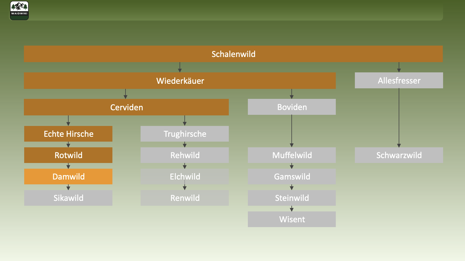 Das Damwild gehört zu den echten Hirschen und existiert in zwei Unterarten: das Europäische und das Mesopotamische Damwild, welches heute noch in Persien vorkommt. In prähistorischer Zeit war Damwild in weiten Teilen der nördlichen Halbkugel verbreitet, verschwand jedoch mit der letzten Eiszeit aus Mitteleuropa. Die Römer brachten es aus den Rückzugsgebieten in Kleinasien und Zypern nach Spanien, Frankreich, England und möglicherweise auch nach Westdeutschland, wo es sich fortan ausbreitete. Heute finden sich die größten Damwildpopulationen in Deutschland in Mecklenburg-Vorpommern, Brandenburg, Niedersachsen, Schleswig-Holstein und Sachsen-Anhalt. Dank seiner hohen Anpassungsfähigkeit und geringen Ansprüche an Lebensraum und Nahrung gilt das Damwild als pflegeleicht und wird auch in Damwildfarmen zur Wildfleischgewinnung gehalten. In einigen Gebieten gefährden jedoch überhöhte Damwildbestände die Ziele der Waldumbauprogramme.