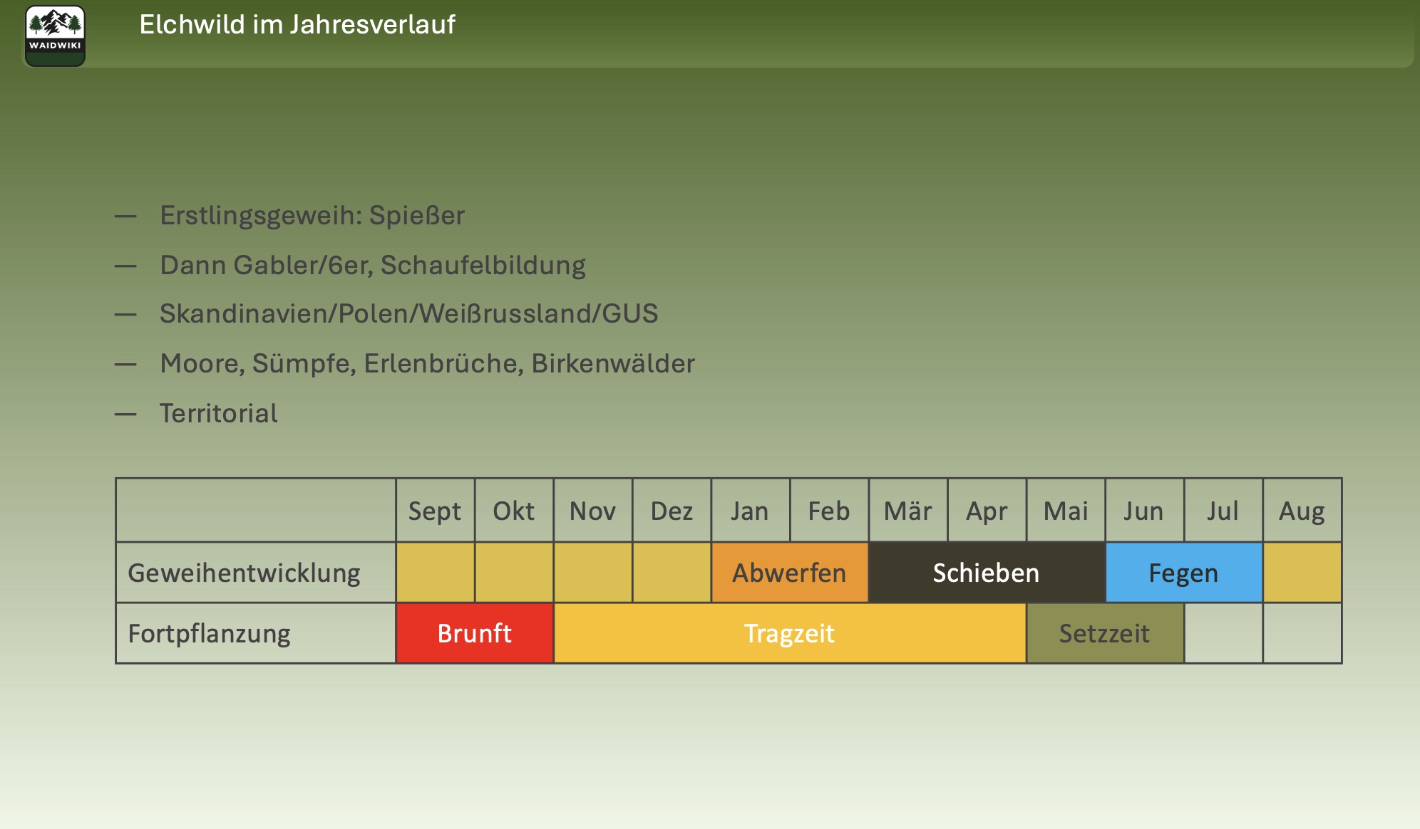 Elchwild wird im zweiten Lebensjahr geschlechtsreif. Die Hauptbrunftzeit ist im September und ähnelt der Blattzeit des Rehwildes. Während dieser Zeit sind die Hirsche besonders aggressiv. Nach etwa 8 Monaten Tragzeit setzen die beschlagenen Tiere zwischen Ende April und Ende Mai 1-2, selten 3 Kälber.