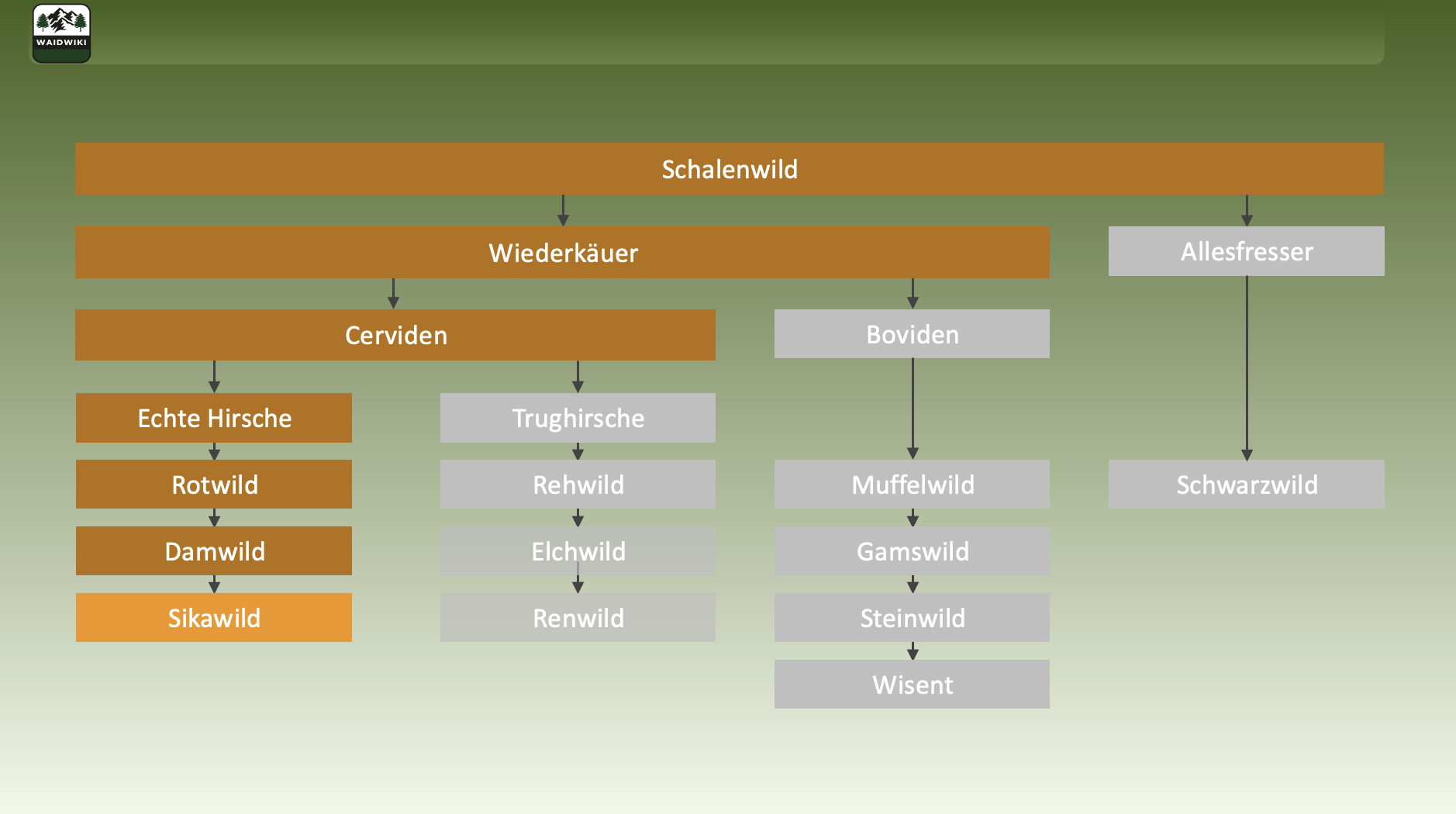 Der Zahnwechsel, ähnlich wie beim Rotwild, ist meist mit 28 Monaten abgeschlossen. Sikawild besitzt Grandeln.