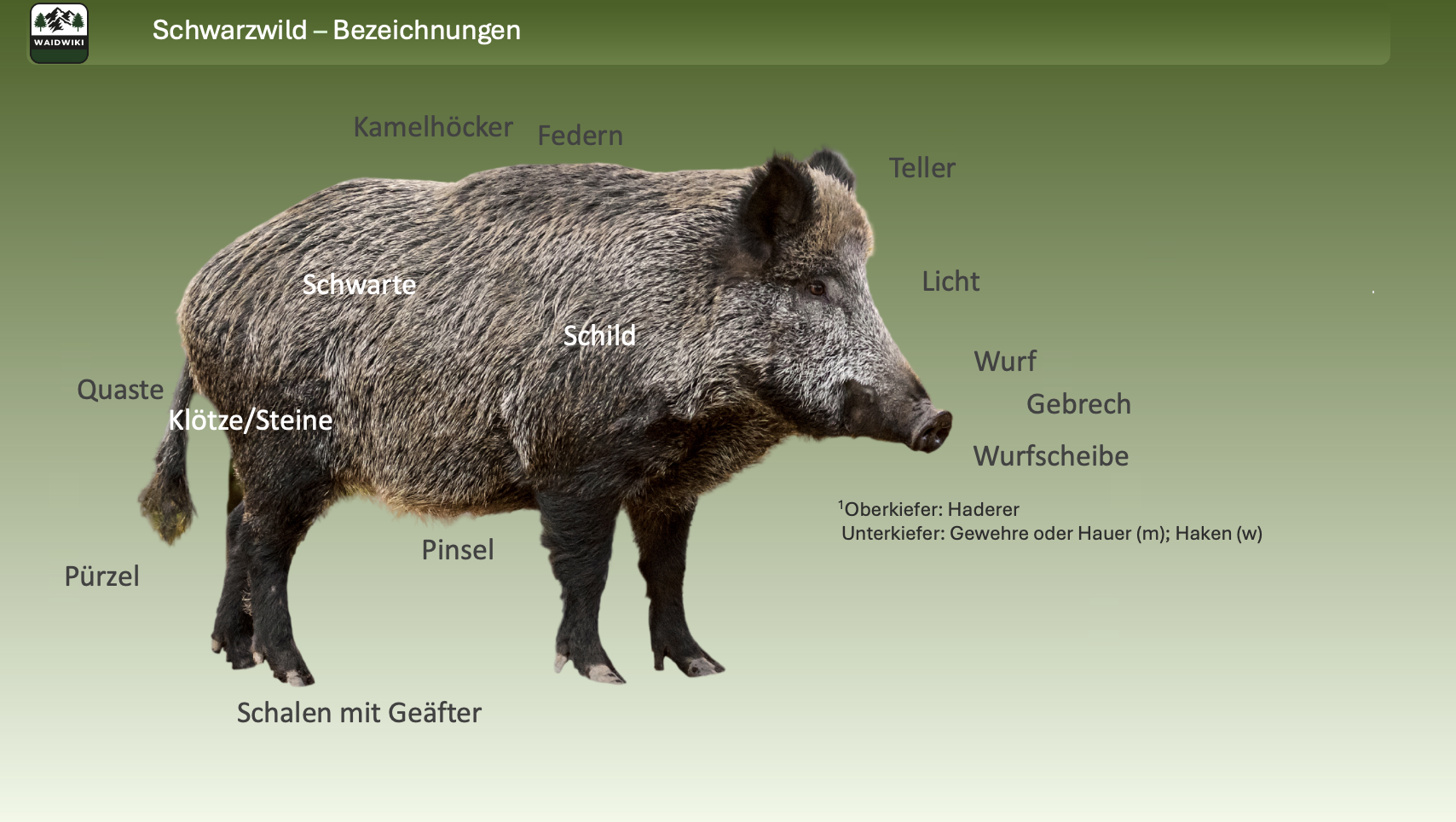 Das Schwarzwild zeichnet sich durch einen gedrungenen Körper mit hohem Widerrist, ein keilförmiges Haupt, kleine Augen (Lichter) und dreieckig spitze Ohren (Teller) aus.