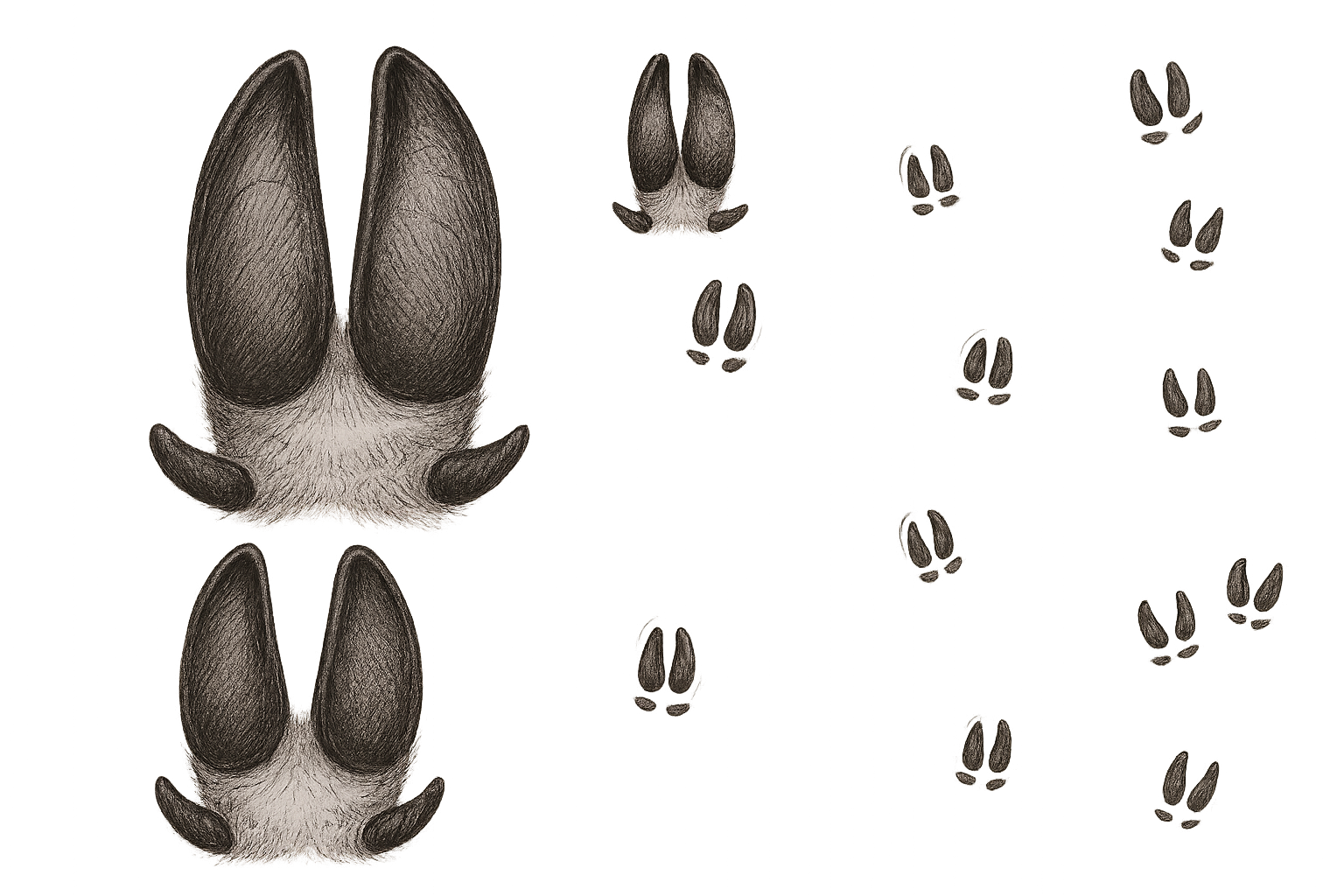 Erkennbar am seitlich herausragenden Geäfter, das im Gegensatz zum Rotwild nicht direkt hinter dem Trittsiegel steht. Der Tritt wirkt trapezförmig, Größe variiert je nach Alter und Geschlecht.