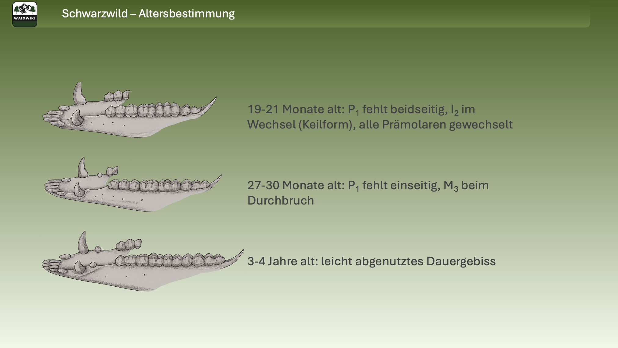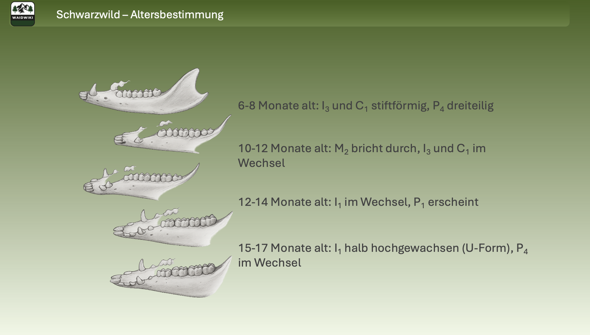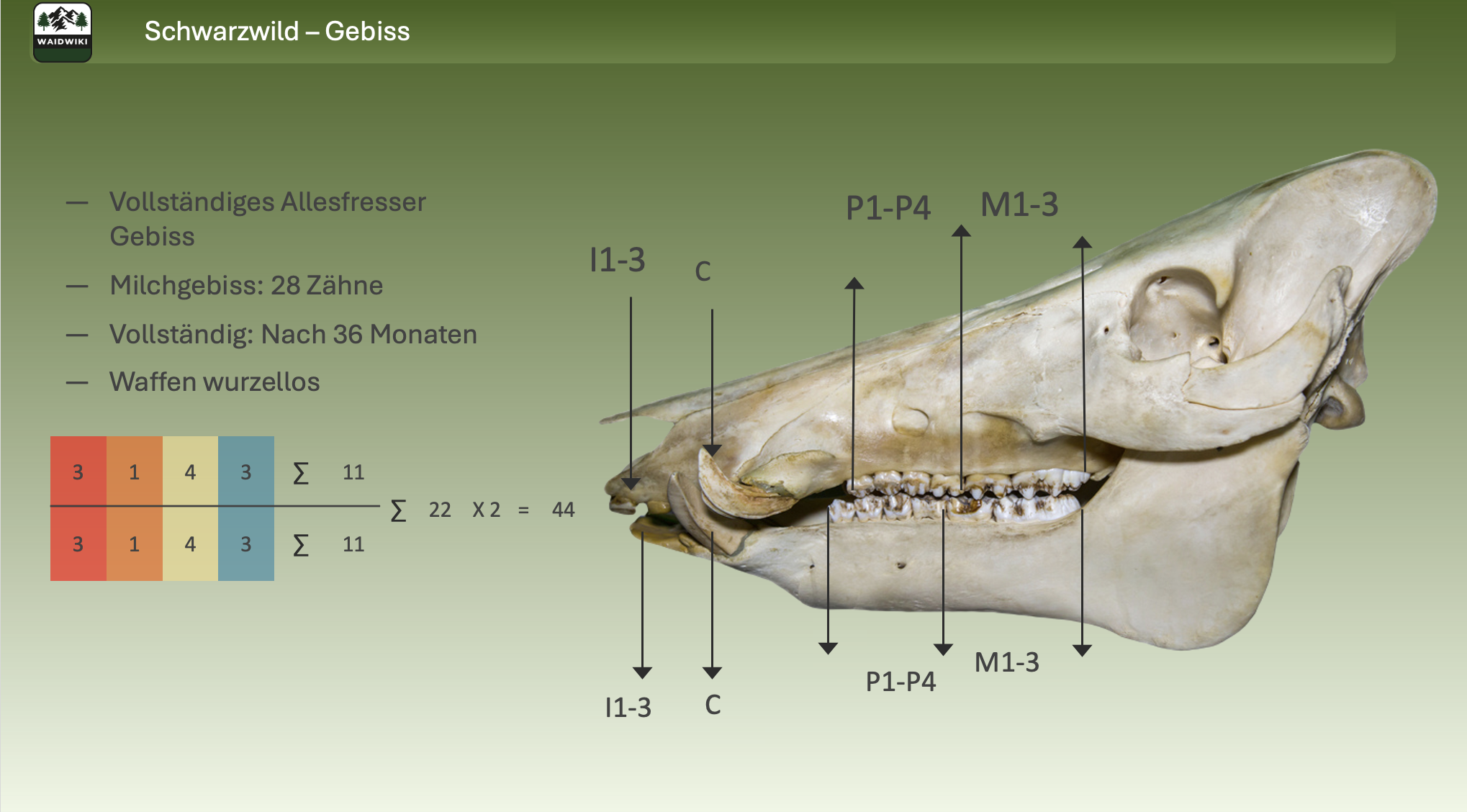 Zahnformel: 3-1-4-3 = 44 Zähne. Ursprüngliches, vollständiges Gebiss. Milchzähne werden zwischen dem 10. und 20. Lebensmonat durch Dauerzähne ersetzt. Die Eckzähne der Keiler (Gewehre) sitzen zu 2/3 ihrer Länge im Unterkiefer und sind am Ende offen. Die Eckzähne der Bachen (Haken) verjüngen sich zur Wurzel hin.