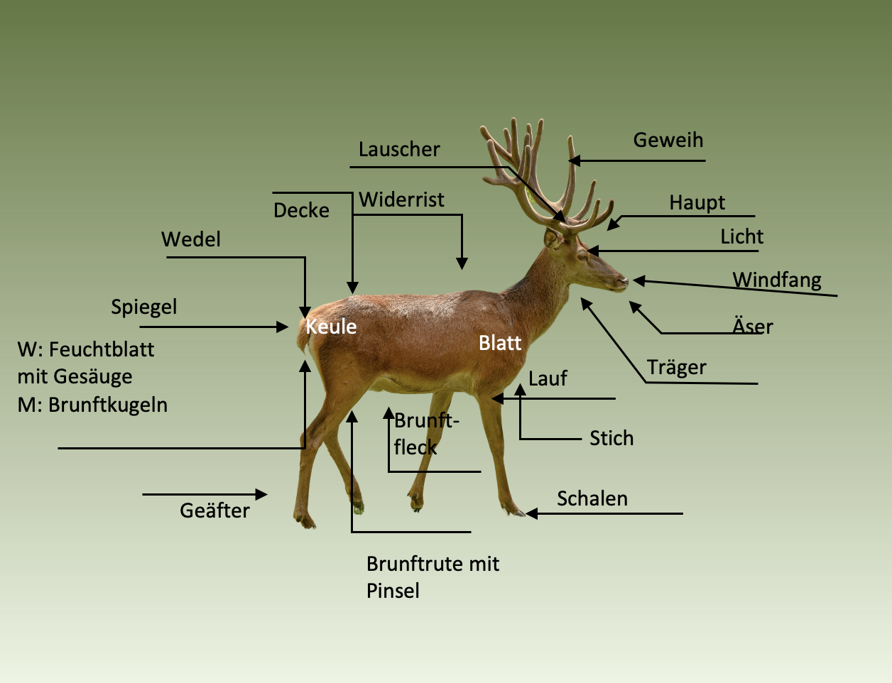 - **Brunftschrei**: Der Hirsch schreit, röhrt, orgelt, trenzt, knört und gibt Sprengruf von sich.